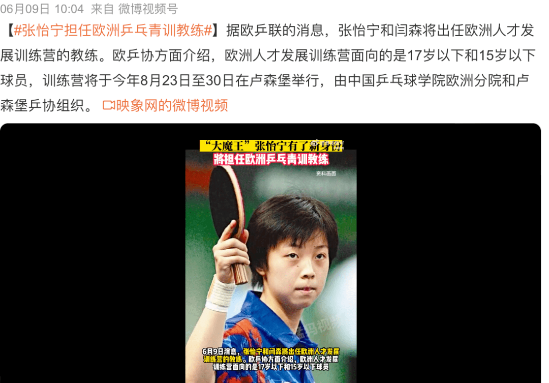 但近几年,女儿长大了,张怡宁开始回归乒乓领域。一开始,她是在各大赛事做解说,今年6月宣传张怡宁将出任欧洲人才发展营的教练,这是中国乒乓球学院欧洲分院和卢森堡乒协组织的。