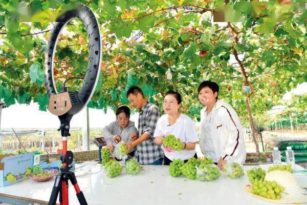 2022年8月9日,福建福安市赛岐镇象环村的葡萄种植园,返乡创业大学生林恩辉(右二)、陈莉瑾(右一)在推销刚采摘的葡萄。图/新华