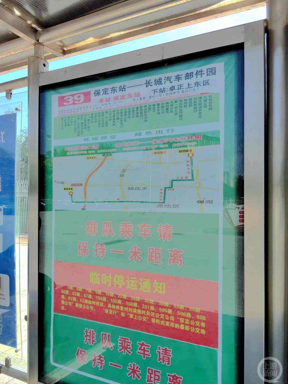 ▲7月,保定东站公交站牌上贴着的23条线路临停通知。 摄影/上游新闻记者 张锦
