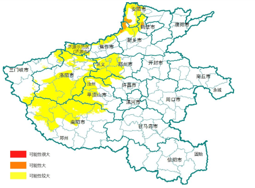 地质灾害黄色预警地区包括郑州荥阳市、惠济区、二七区、上街区、新密市、新郑市、登封市、巩义市,洛阳新安县、孟津区、偃师区、宜阳县、洛宁县、伊川县、汝阳县、嵩县、栾川县,平顶山郏县、宝丰县、鲁山县、叶县、汝州市,鹤壁鹤山区、山城区,新乡凤泉区、卫辉市,焦作市区、修武县、博爱县、沁阳市、孟州市,许昌禹州市,三门峡渑池县、陕州区、义马市、卢氏县,南阳宛城区、西峡县、南召县、方城县、内乡县、淅川县、镇平县。