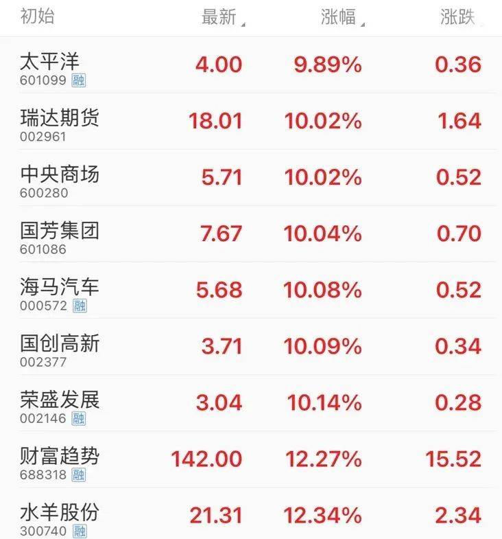 4板:国创高新,国芳集团 3板:海马汽车 2板:太平洋,城建发展,天晟新材,美丽生态,西南证劵,瑞达期货,中央商场,红蜻蜓,荣盛发展