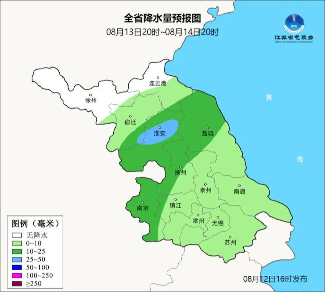 8月12日20时至8月13日20时:江淮之间北部和淮北地区阴有阵雨或雷雨,局部雨量大,其他地区多云,部分地区有分散性雷阵雨。最高温度淮北地区31℃左右,本省东南部地区36℃左右,其他地区34~35℃;最低温度沿江和苏南地区26~27℃,其他地区25℃左右。全省偏南风转偏北风,风力都是3-4级,有雷雨地区雷雨时短时阵风7-9级。