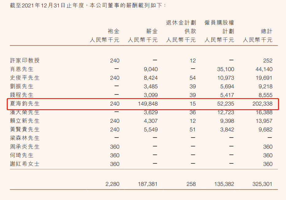 单从袍金、薪金来算,夏海钧去年薪资收入约为14.1万元。但在恒大披露的2021年年报中,夏海钧仅薪金就高达1.49亿元,总计薪酬高达2.02亿元。2020年,夏海钧在担任恒大行政总裁时的薪金也有1.65亿元,总计薪酬高达2.04亿元。