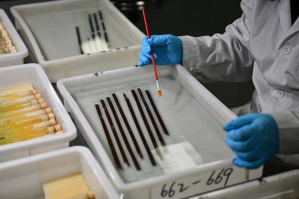 △一支支“天回医简”被放置在蒸馏水中,成都文物考古研究院文保中心工作人员在进行清理工作。