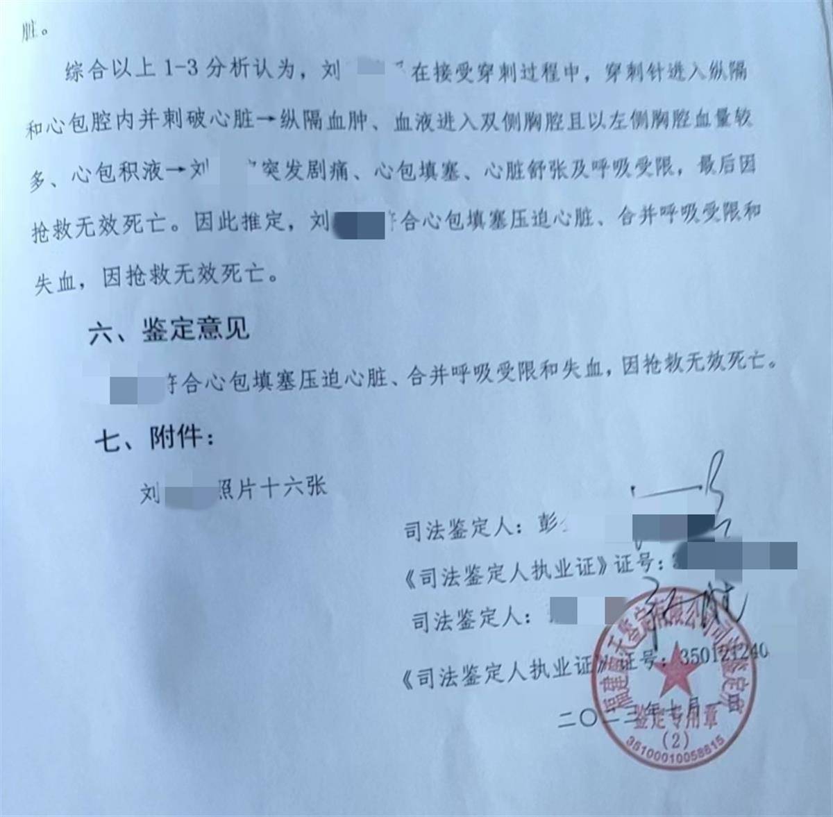 司法鉴定所7月出具的意见书显示,鉴定方分析死亡原因时认为,孩子在“接受穿刺过程中,穿刺针进入纵隔和心包腔内并刺破心脏→纵隔血肿、血液进入双侧胸腔且以左侧胸腔血量较多、心包积液→孩子突发剧痛、心包填塞、心脏舒张及呼吸受限,最后抢救无效死亡”。