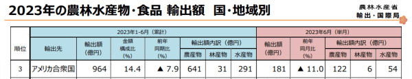 2023年上半年出口额下降较大的主要国家和地区:美国、马来西亚、埃及、泰国 截图自农林水产省报告