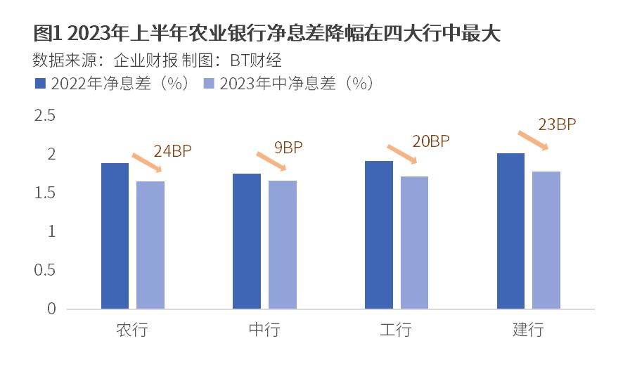 2023年上半年,42家A股上市银行中,有40家上市银行净息差收窄。BT财经盘点发现,和2022年末相比,农行净息差收窄24BP,至1.66%。不仅上述1.66%的净息差水平是中央四大行中最低的一家,24BP的降幅也是四者中最大。