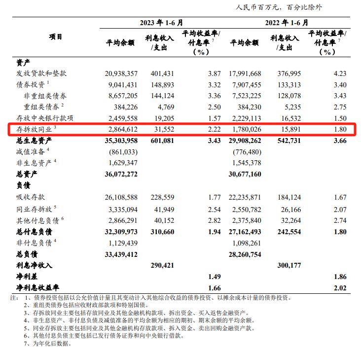 BT财经注意到,在负债方面,同业存拆放也是主要的增长点。2023年上半年,农行总付息负债中,3.34万亿元为同业存拆放,较2022年同期的1.78万亿元增长近90%。