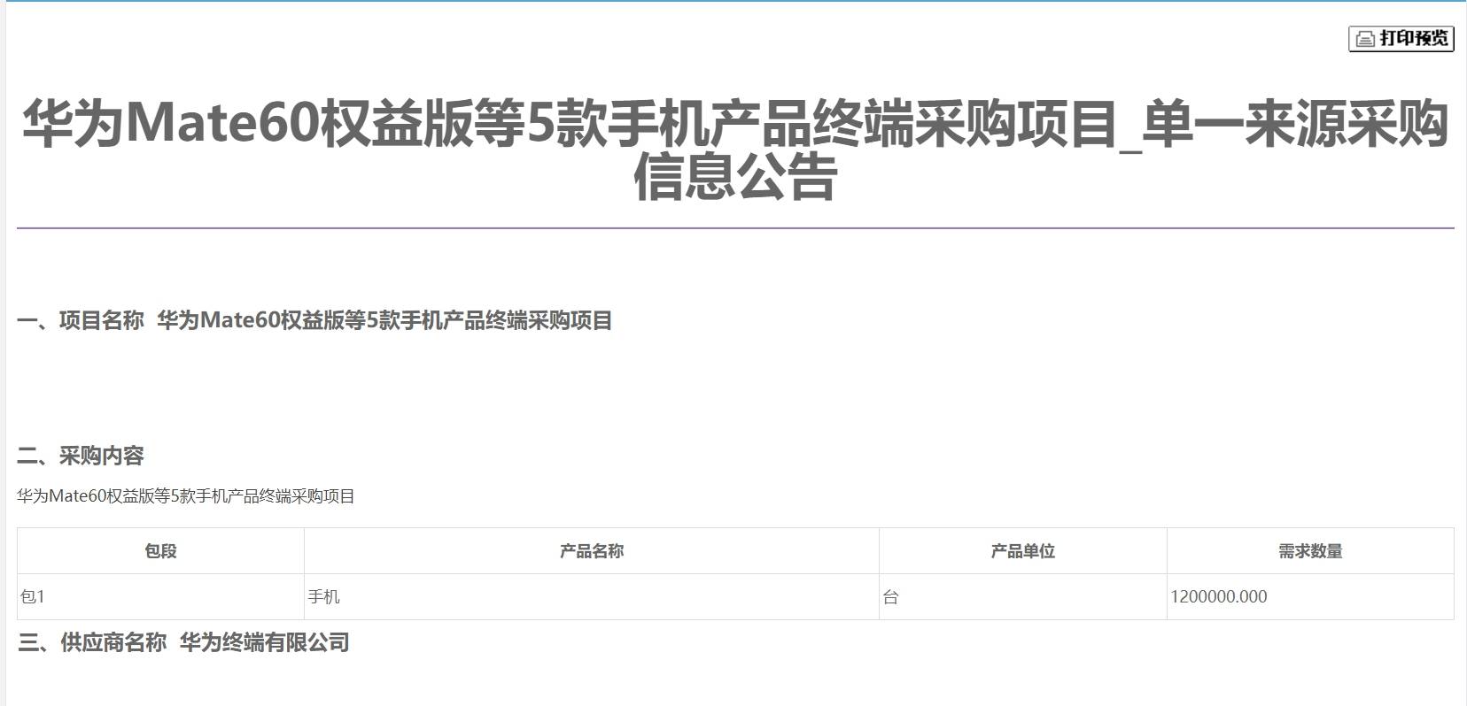 新京报贝壳财经讯(记者孙文轩)10月16日,记者从中国移动采购与招标网获悉,中国移动通信集团终端有限公司近日从华为终端有限公司采购华为Mate60权益版等5款手机,需求数量为120万台。