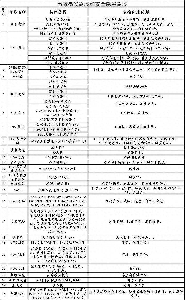 八、交通事故,及时处置。发生事故后无法及时撤离现场的,应开启双闪灯、打开示廓灯、后位灯,安全放置三角警示牌(高速路、国省道等道路应放置在距车150米远距离),车内人员第一时间撤离到安全地带,同时选择报警。高速公路、国省道事故隐患路段提示交警部门结合往年交通事故及典型交通违法等情况,发布以下交通事故隐患点段及安全出行提示,请广大交通参与者注意交通安全。