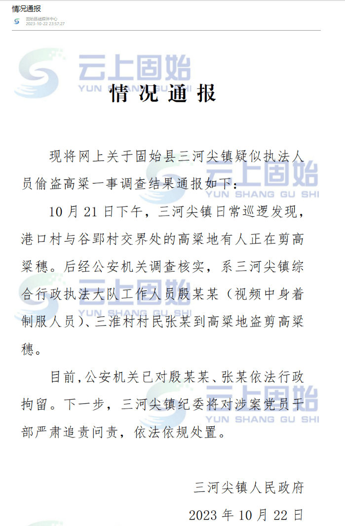 10月22日深夜,三河尖镇人民政府发布情况通报称,参与剪高粱穗的人员中确有镇综合行政执法大队工作人员。