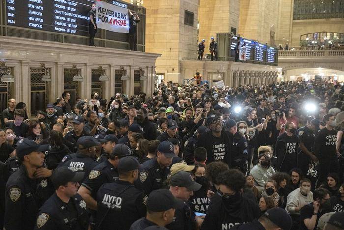 10月27日,美国纽约再次爆发大规模示威活动,抗议以色列轰炸加沙。数千人“占领”了纽约中央车站的大厅,人们举着写有支持巴勒斯坦人的横幅。还有戴着手铐的年轻人排成了一长列,他们身穿黑色运动衫,上面用白色印着“不要以我们的名义”和“立即停火”的字样。