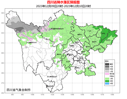 9日晚上到10日白天:盆地各市阴天,部分地方有小雨,东北部局部地方有中雨;阿坝州和甘孜州北部阴天间多云有阵雪(雨),攀西地区和川西高原其余地方晴间多云。