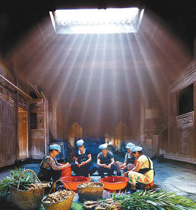铜陵不仅是重要的白姜产区,也是传统村落集中区域。图为铜陵市天门镇江村,姜农在古宅中刮姜。 徐 靖 刘荣胜摄影报道