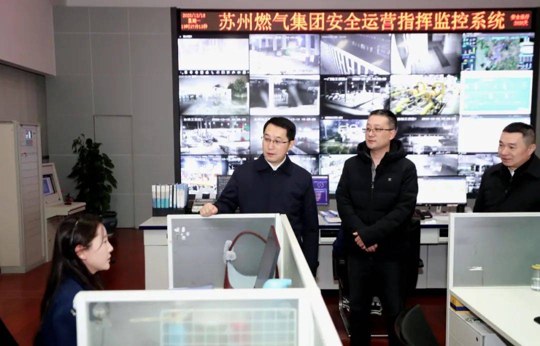 在苏州燃气集团,吴庆文详细了解燃气监测、储气安全等情况,要求加强设施维护和预警监测,确保百姓用气安全。
