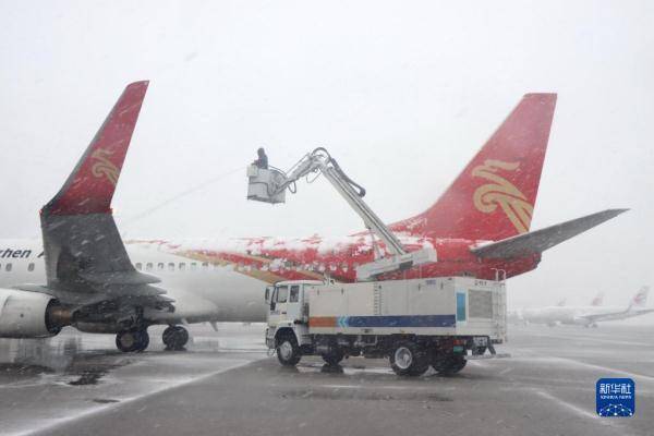 12月18日,江苏常州国际机场的工作人员为即将起飞的航班喷洒融雪剂。