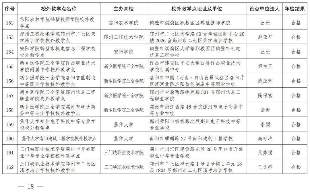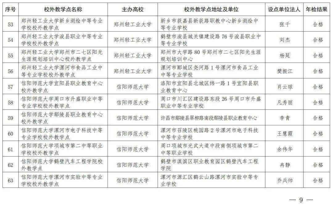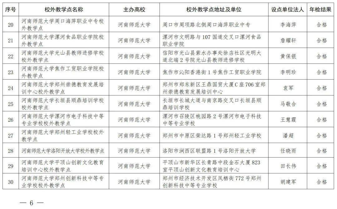 我省备案的198个高等学历继续教育校外教学点均参加2023年度年报年检,根据年报年检情况,经研究,确定河南大学洛阳开放大学校外教学点等192个校外教学点年检结果为合格;河南科技大学濮阳市华龙区硕博教育培训中心校外教学点年检结果为暂不合格;信阳师范大学淮滨县远博中等职业学校校外教学点等5个校外教学点年检结果为不合格(见附件)。