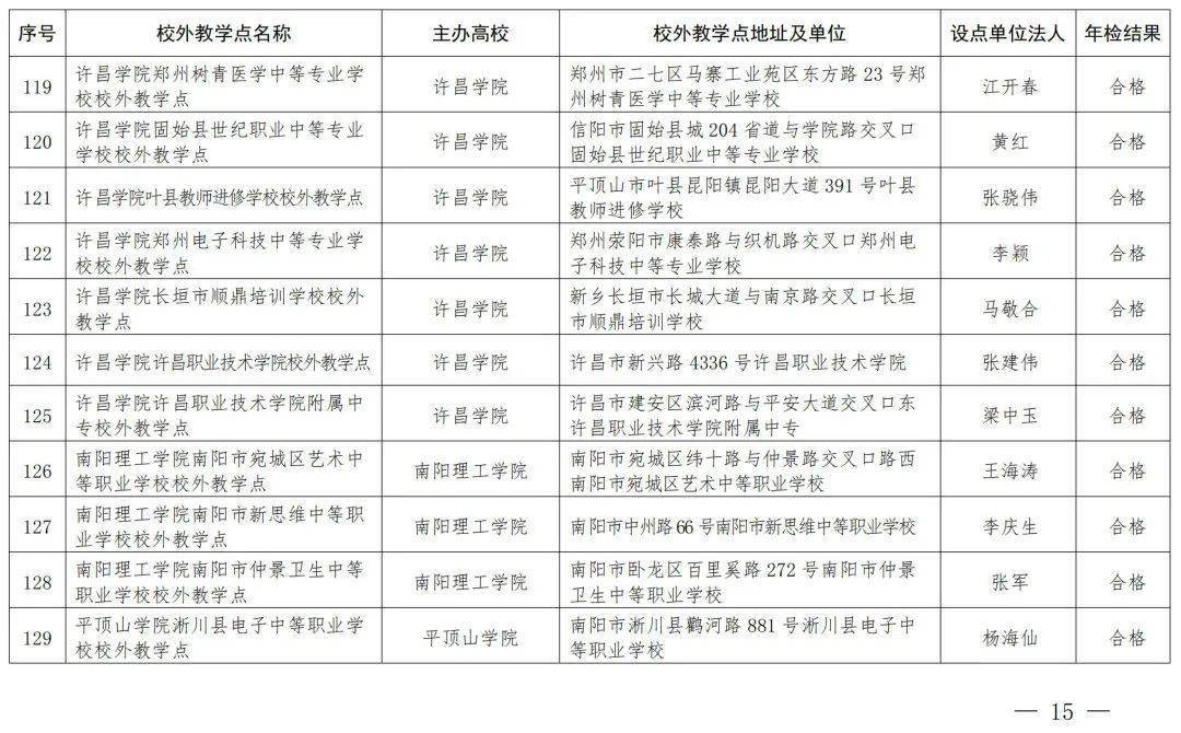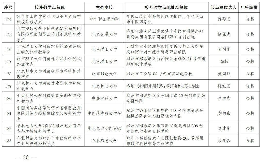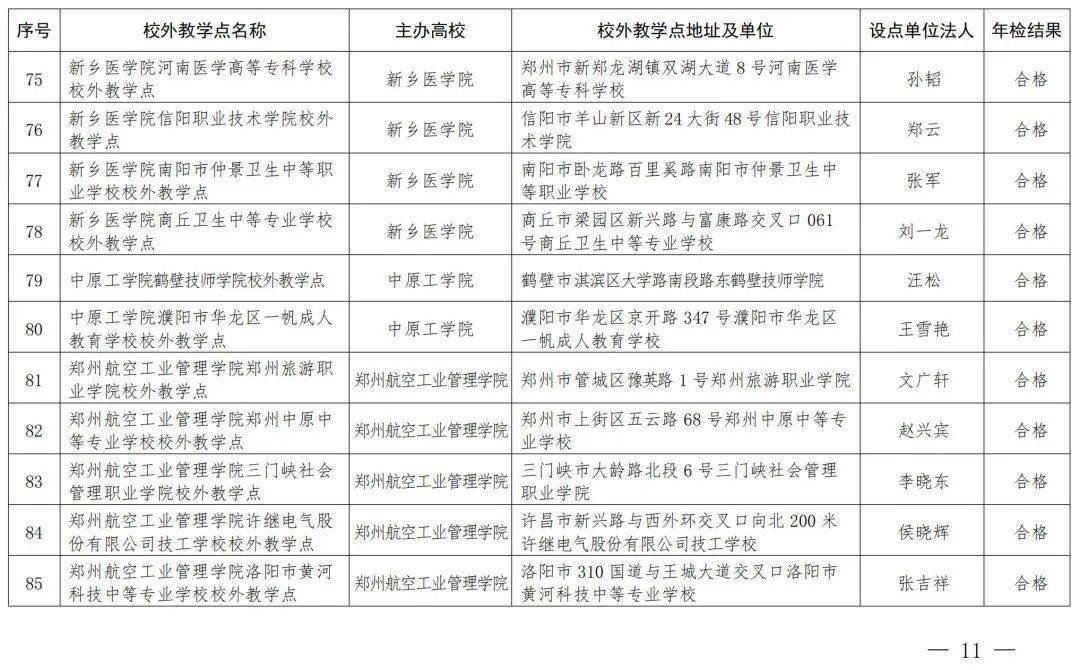 按照《河南省教育厅转发教育部办公厅关于严格规范高等学历继续教育校外教学点设置与管理工作的通知》(教职成〔2022〕206号)和《河南省教育厅办公室关于开展2023年高等学历继续教育校外教学点检查工作的通知》(教办职成〔2023〕273号)要求,我厅对有关高校在豫举办的高等学历继续教育校外教学点开展了2023年度年检工作,现将年检结果予以公布。