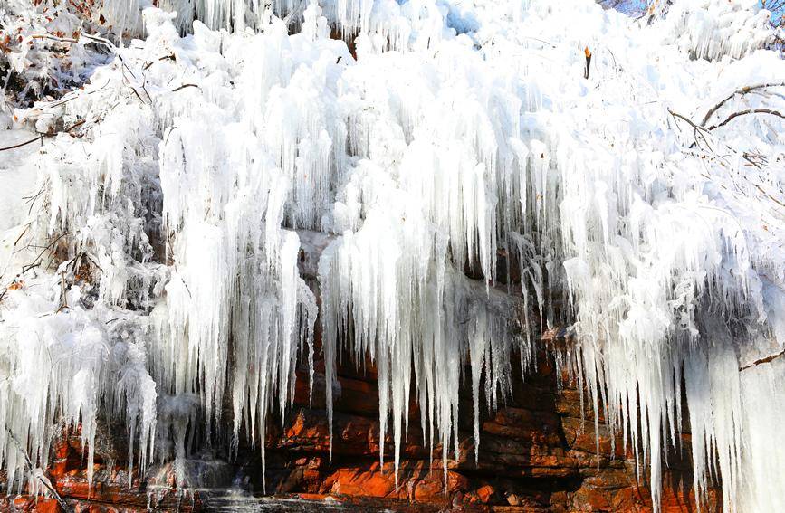 人民网郑州12月27日电(霍亚平)近期随着气温持续走低,位于河南郑州的伏羲山长达5公里的瀑布群逐渐被“冰封”,形成了壮观的冰瀑群景观,造型各异的冰瀑、冰挂,层层叠叠如玉雕般被定格在崖壁之上,吸引众多游客前来观赏。