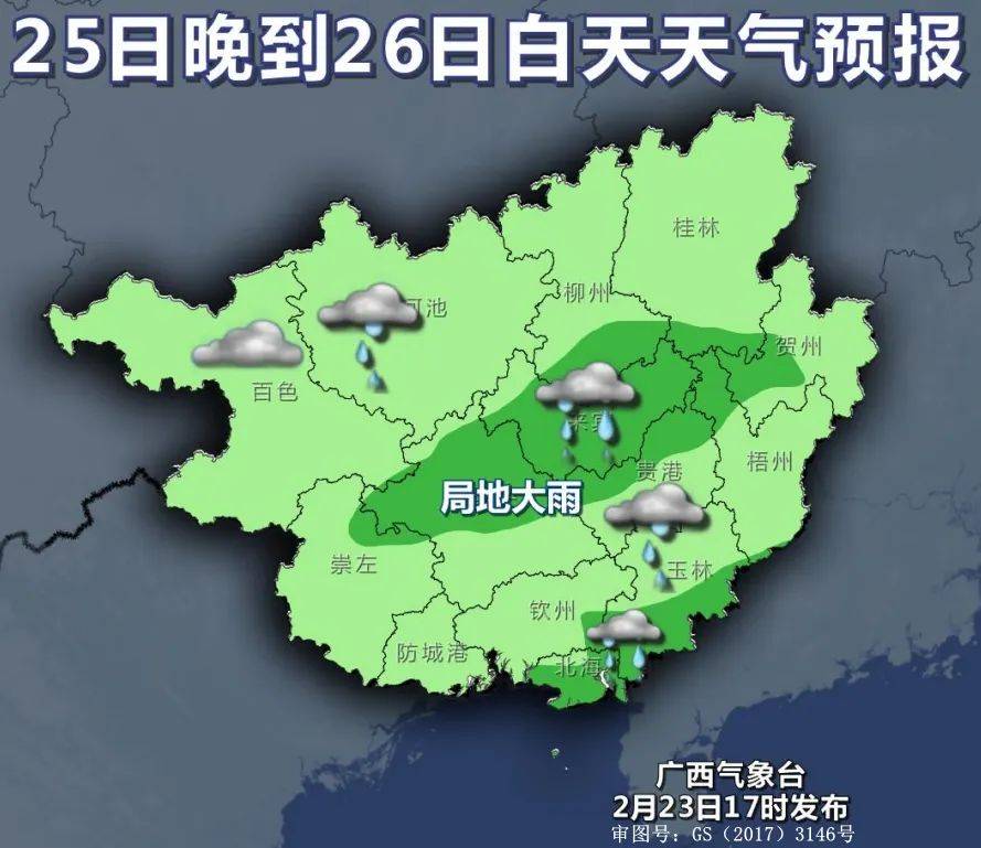 广西气象台预计,桂东和桂南地区雨势较大,将出现小到中雨,局地有大雨。24日至26日,桂中、桂南部分地区日平均气温低于14℃。其中,24日晚上至25日白天,全区阴天大部有小雨,其中桂南局地有中雨。25日晚上至26日白天,桂东部分地区有小到中雨,局地大雨。