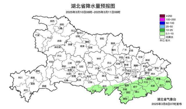 3月9日08时-10日08时,鄂西南、江汉平原、鄂东北南部、鄂东南小雨转多云;其他地区阴天到多云。最高气温北部12~16℃、南部9~12℃,最低气温3~9℃,偏东风2到3级。