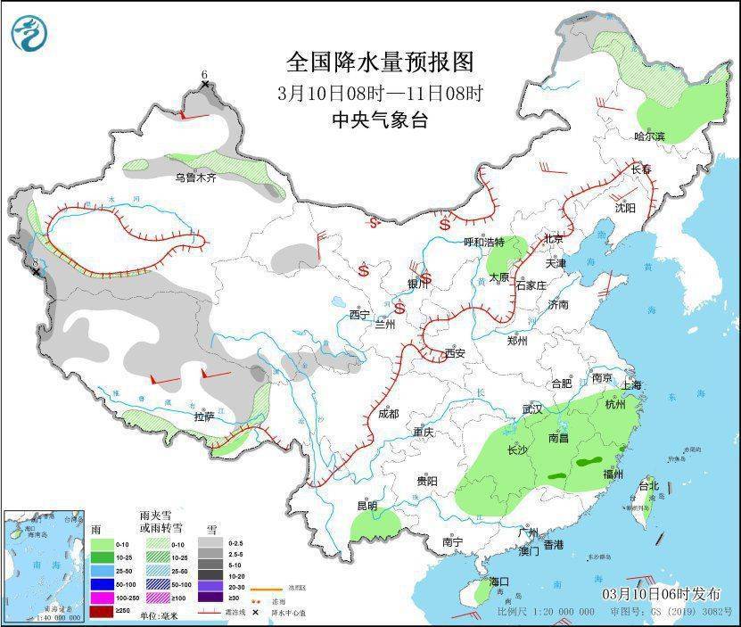 3月10日8时至11日8时,新疆北疆和南疆西部山区、内蒙古东北部、黑龙江西北部、西藏北部和东部、青海南部、甘肃河西等地部分地区有小到中雪或雨夹雪,其中,新疆阿勒泰、西藏西部等地部分地区有大雪(5~8毫米)。黑龙江南部、山西北部、云南东南部、江南大部、华南北部和海南岛等地部分地区有小到中雨。内蒙古中东部、黑龙江西南部、辽宁北部、甘肃河西、宁夏北部、山东半岛等地部分地区有4~6级风,新疆北疆北部、西藏北部等地部分地区有7~8级风。