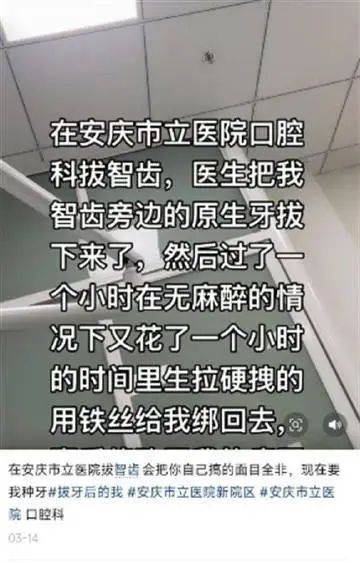 近日,34岁女子疑因被拔错牙后坠楼身亡,引发关注。3月19日,当事人家属告诉记者, 3月12日,吴女士在安徽省安庆市立医院拔智齿,被拔错了一颗原生牙齿,随后医生又把拔下的这颗牙硬塞了回去,“医生用铁丝把几颗牙捆住串起来,这一个半小时没有打麻药,我妹妹硬扛下来的”,导致其牙齿损坏,面部肿胀,晚上疼得睡不着。