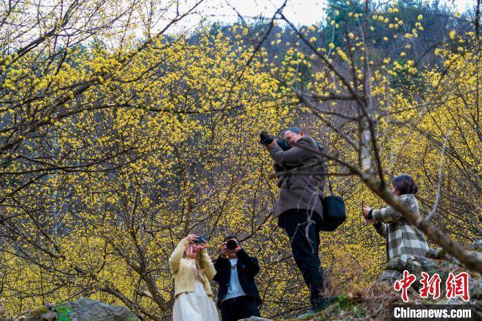近日,在河南省西峡县太平镇、二郎坪镇、寨根乡等地20万亩山茱萸基地,盛开的山茱萸花金灿灿,吸引众多游客赏花踏春。图为游客在山林间拍摄山茱萸花。李想 摄