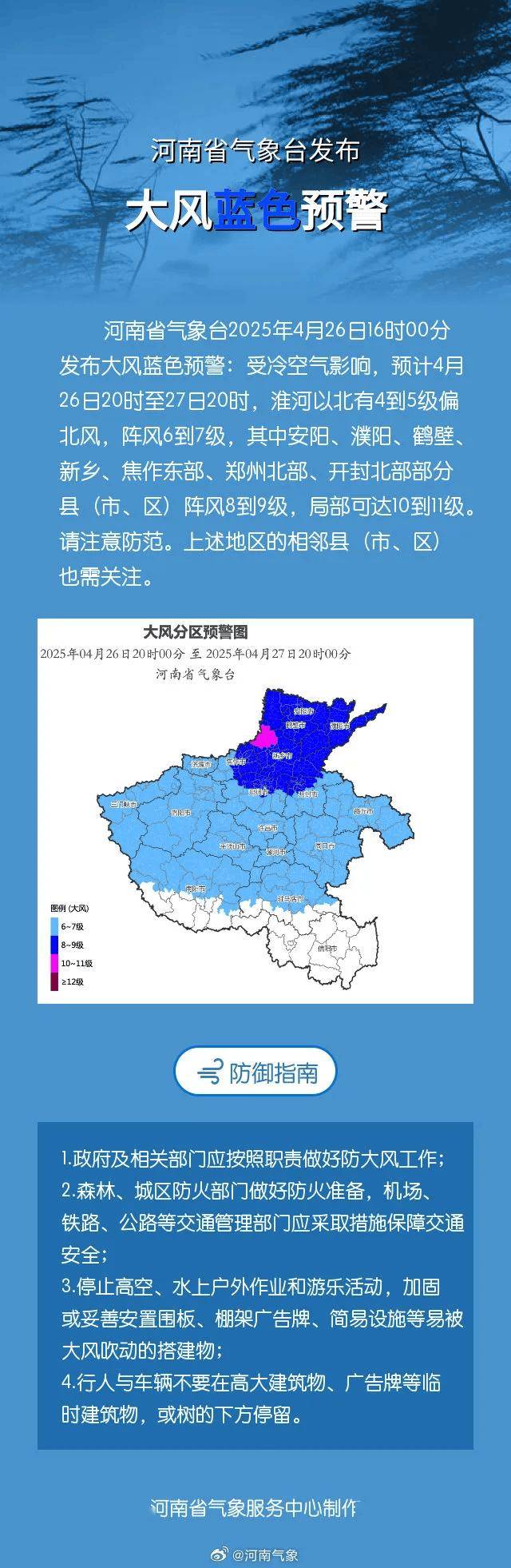 河南省气象台2025年4月26日16时00分发布大风蓝色预警:受冷空气影响,预计4月26日20时至27日20时,淮河以北有4到5级偏北风,阵风6到7级,其中安阳、濮阳、鹤壁、新乡、焦作东部、郑州北部、开封北部部分县(市、区)阵风8到9级,局部可达10到11级。请注意防范。上述地区的相邻县(市、区)也需关注。
