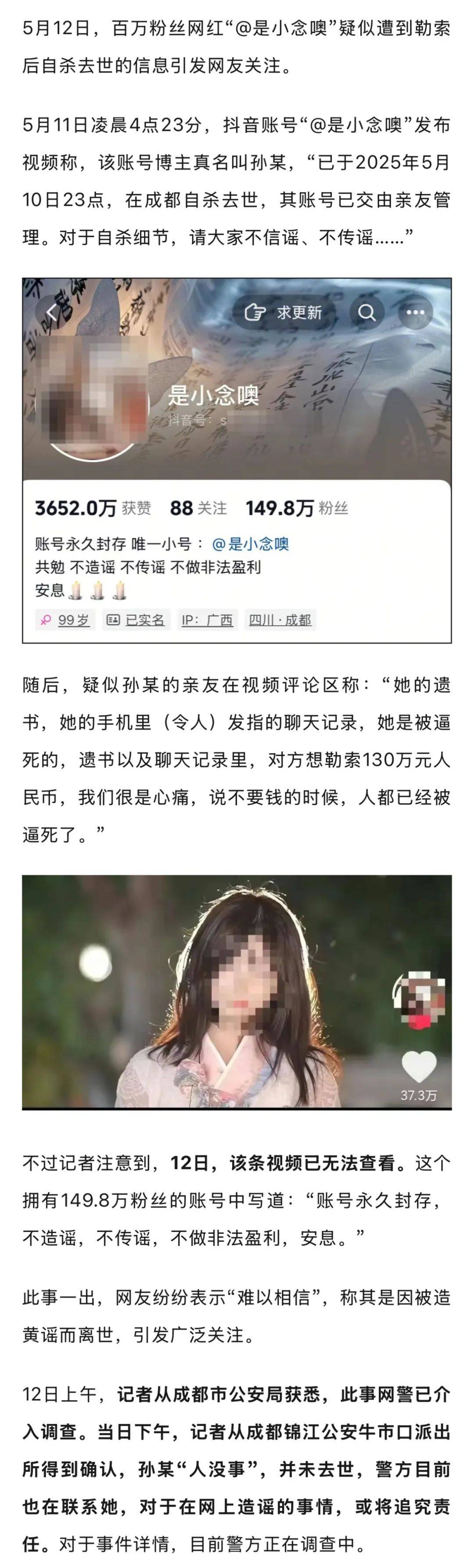 今天凌晨(5月13日),成都锦江公安发布警情通报:孙某(女,18岁)编造“自杀离世”,冒充亲友自导自演跟评,被立案调查。