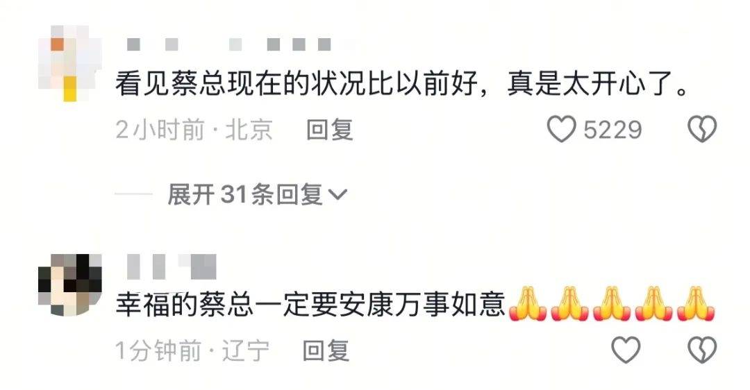 评论区,不少网友留言:“看见蔡总现在的状况比以前好,真是太开心了。”“蔡磊老师比以前精神多了。”