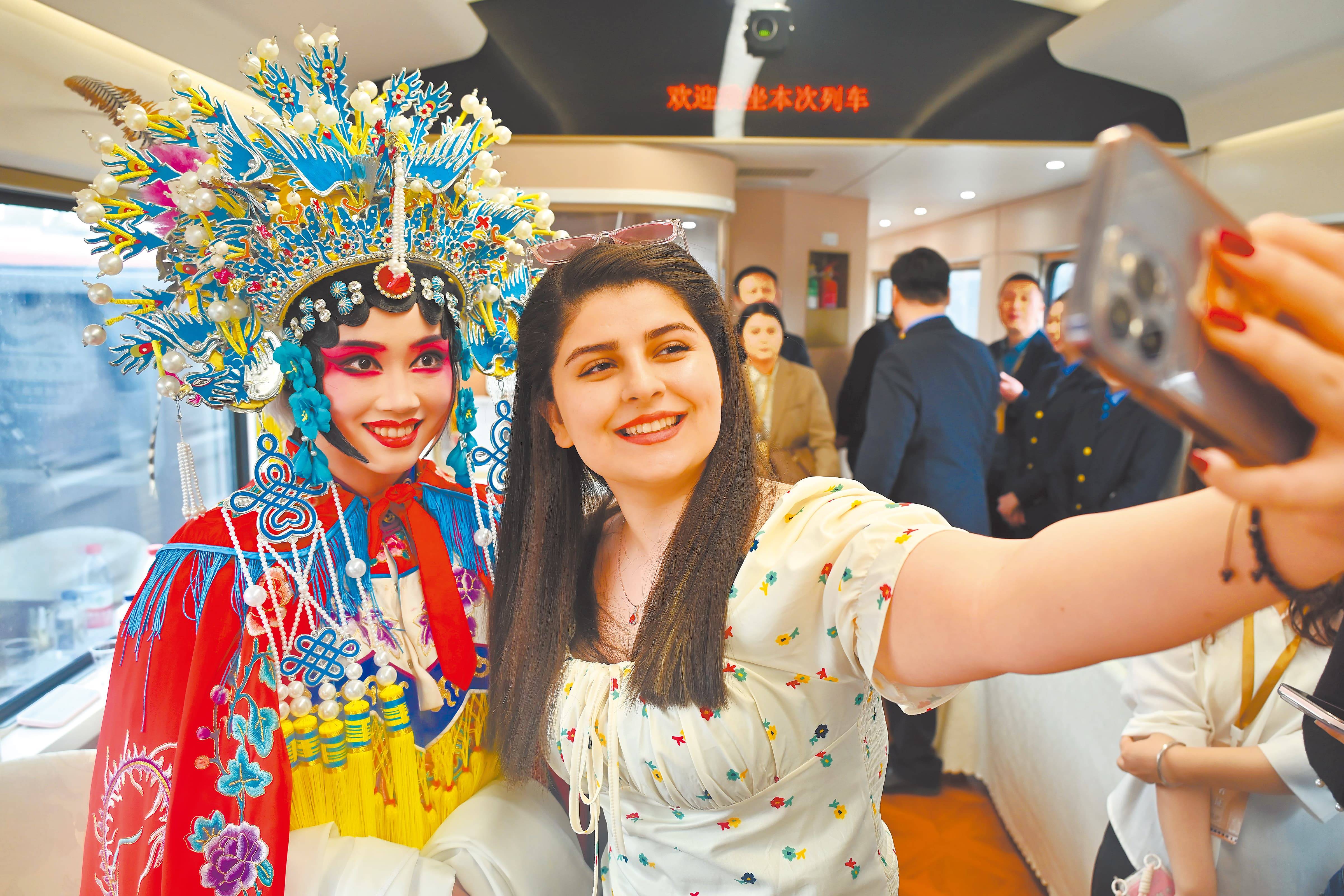 在“中原铁道·大河之南号”特色旅游列车上,国外旅客沉浸式感受河南特色文化。(祁映辰 曹源 摄)