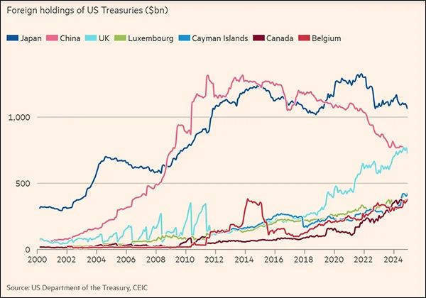 几大主要美债持有者持有量变化趋势图,各颜色代表“债主”从左至右依次为日本、中国、英国、卢森堡、开曼群岛、加拿大、比利时。 《金融时报》制图