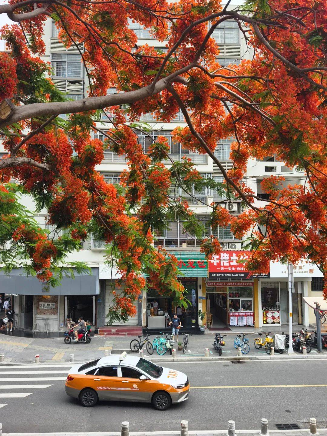 文屏路、公园东路等路段有不少满树繁花的凤凰木。微风掠过凤凰木冠,繁盛的红花如星火点燃夏日热情,又如灿烂绯云染红半边天。