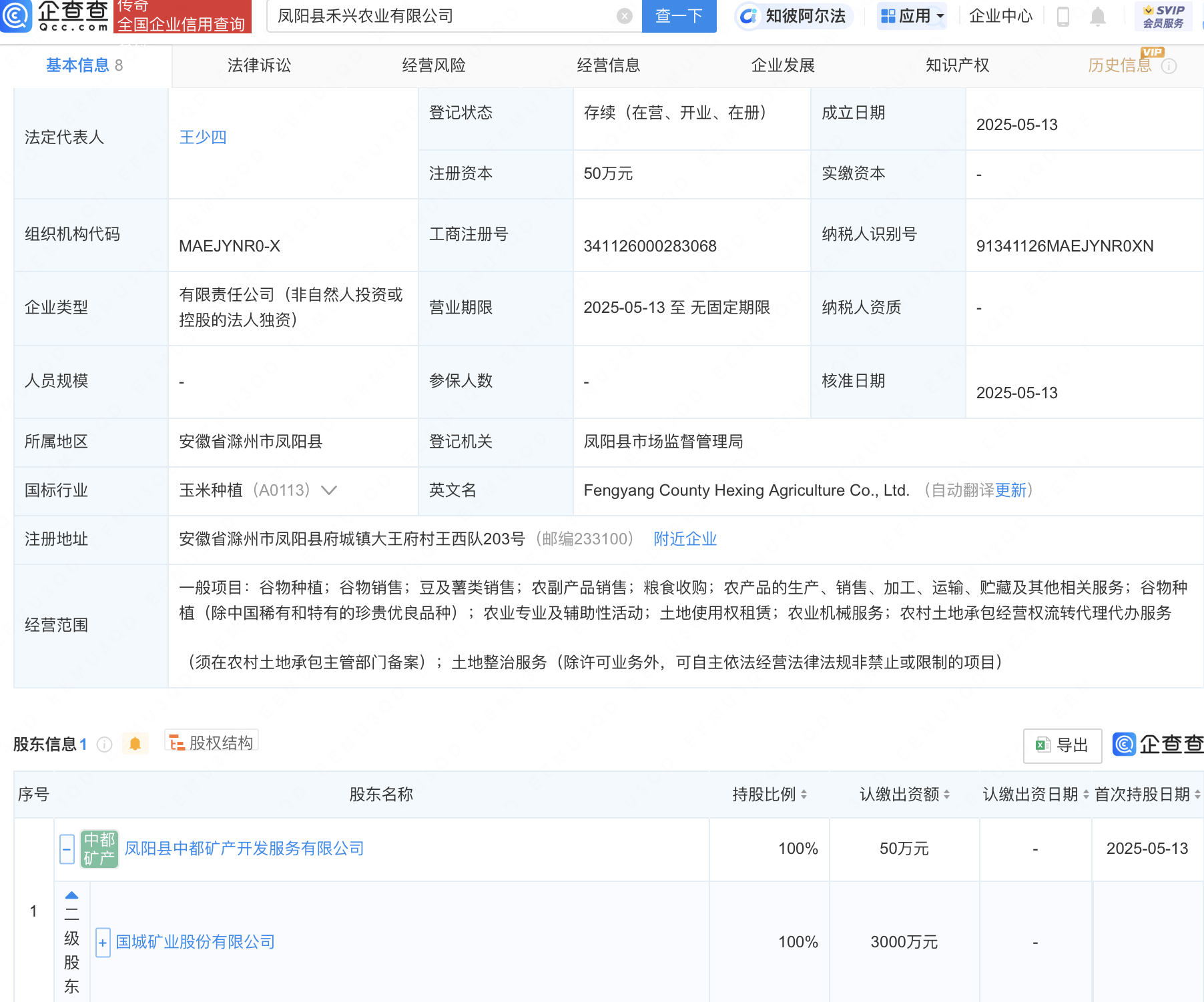 企查查APP显示,近日,凤阳县禾兴农业有限公司成立,法定代表人为王少四,经营范围包含:谷物种植;谷物销售;豆及薯类销售;农副产品销售;粮食收购等。企查查股权穿透显示,该公司由国城矿业(000688)间接全资持股。
