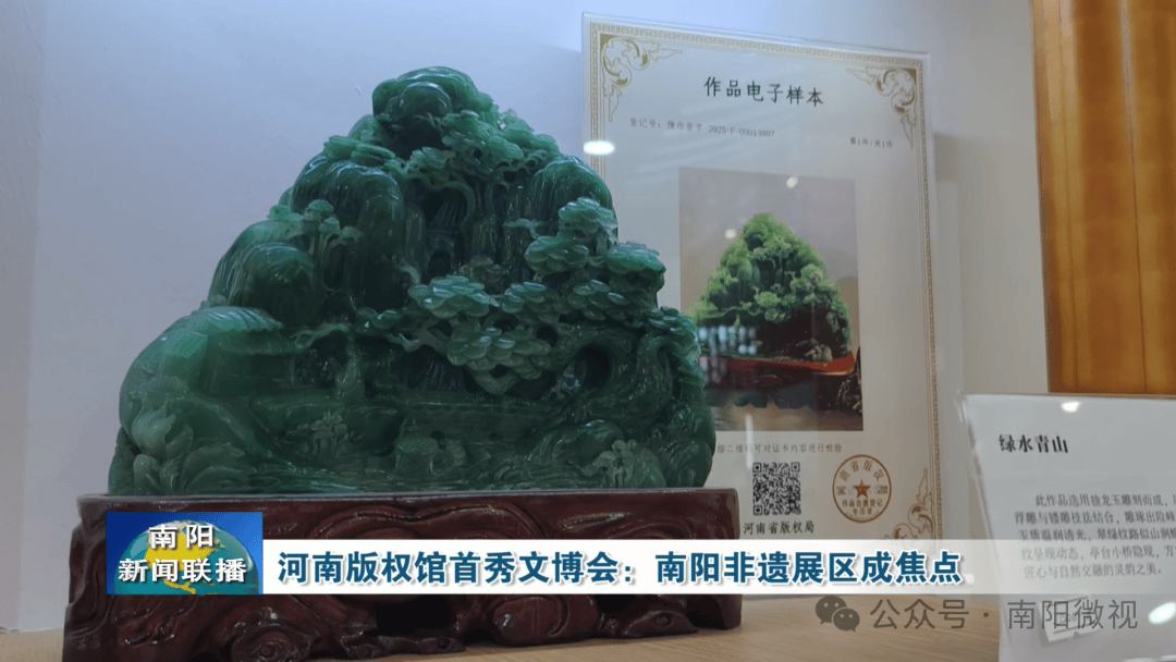在64平方米的河南版权馆展陈空间内,南阳非遗展台前人头攒动。玉雕作品《绿水青山》以刀为笔,纹路间尽显自然灵韵;国家级非遗南阳烙画《花开四季》采用中国画技法烙制,古朴典雅中透出创新活力。这些展品均拥有完整版权“身份证”,展现了南阳构建国家、省、市、县四级保护体系的成效 。