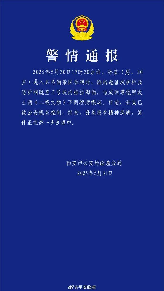 据西安市公安局临潼分局官方微博5月31日消息,2025年5月30日17时30分许,孙某(男,30岁)进入兵马俑景区参观时,翻越遗址坑护栏及防护网跳至三号坑内推拉陶俑,造成两尊铠甲武士俑(二级文物)不同程度损坏。