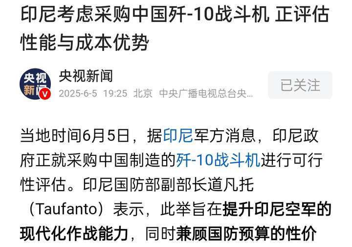 消息来源:央视新闻6月6日报道《印尼考虑采购中国歼10CE战斗机,正评估性能和成本优势》