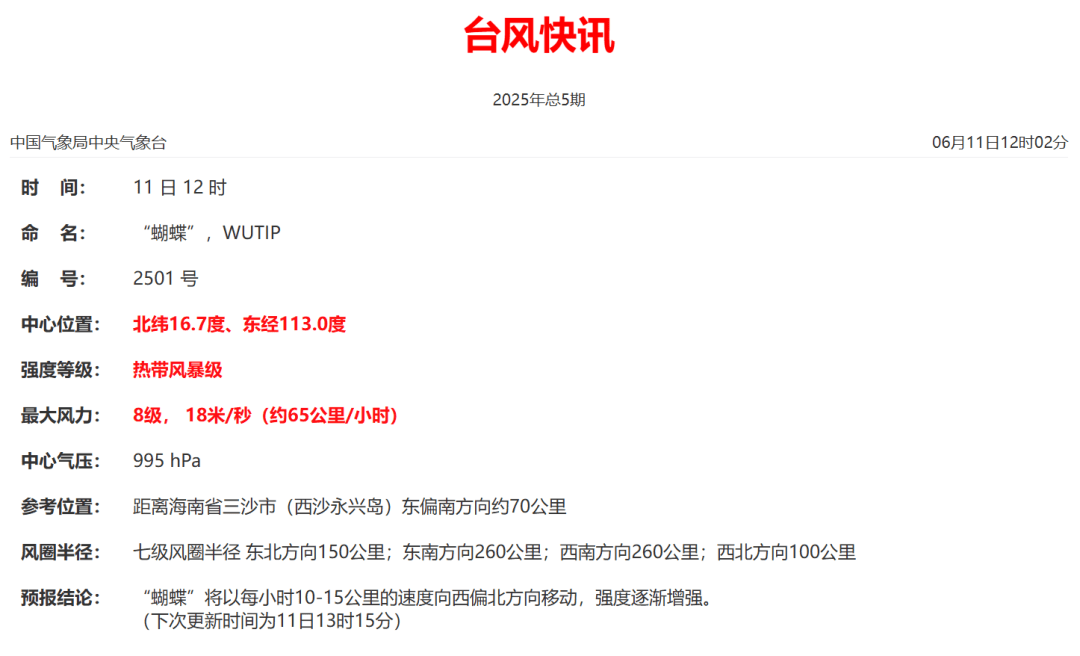 中央气象台6月11日发布 台风蓝色预警: 南海热带低压已于今天(11日)8时在南海中西部海面上加强为 今年第1号台风“蝴蝶”(热带风暴级)。