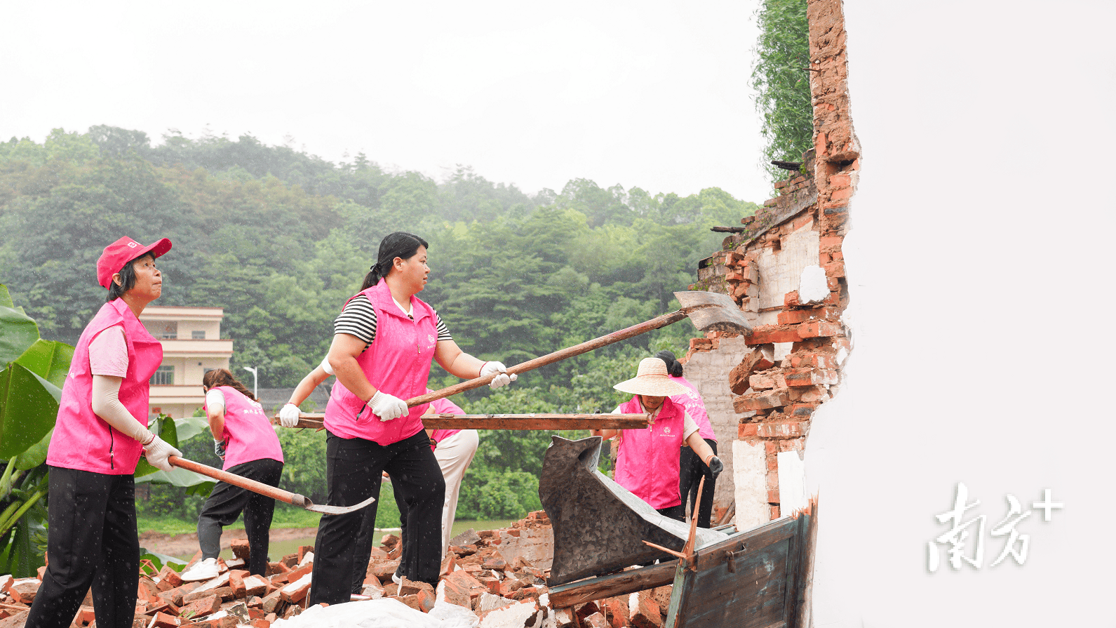 在河仔口村清拆现场,志愿者们扛着锄头、铲子,戴着手套,协助施工人员和户主清理现场木料、红砖、垃圾,搬运水桶、箱子等杂物,她们不怕脏、不怕累,充分发挥“半边天”力量,参与“三清三拆三整治”行动。