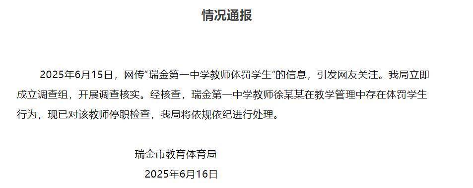 16日下午,瑞金市教育体育局就此事发布通报称,2025年6月15日,网传“瑞金第一中学教师体罚学生”的信息,引发网友关注。该局立即成立调查组,开展调查核实。经核查,瑞金第一中学教师徐某某在教学管理中存在体罚学生行为,现已对该教师进行停职检查,该局将依规依纪进行处理。
