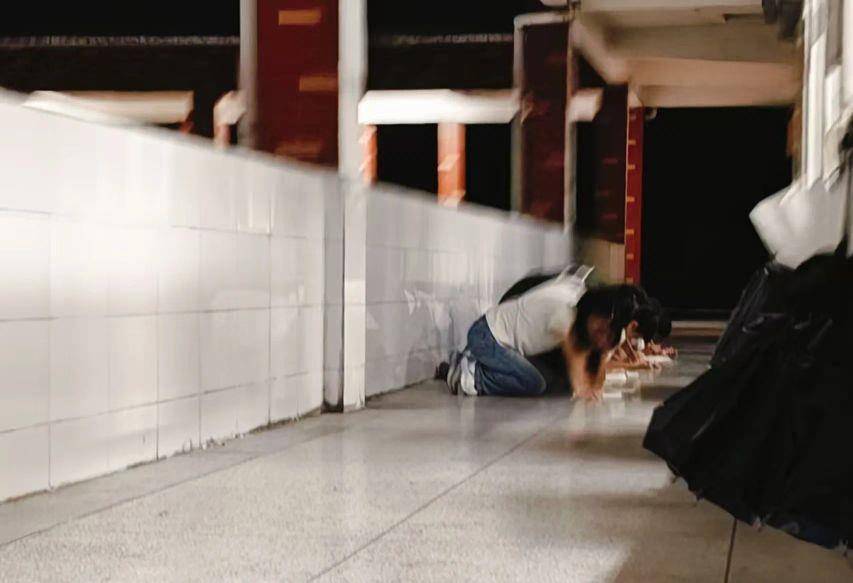 网友发布的图片显示,几人并排跪在一处走廊上,伏下身子疑似写东西,现场还有一名人员背着双手站在一旁。