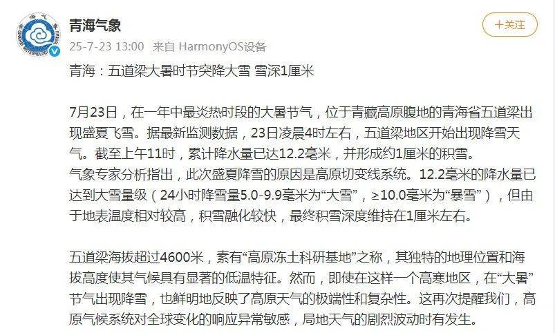 据青海气象消息,7月23日,在一年中最炎热时段的大暑节气,位于青藏高原腹地的青海省五道梁出现盛夏飞雪。