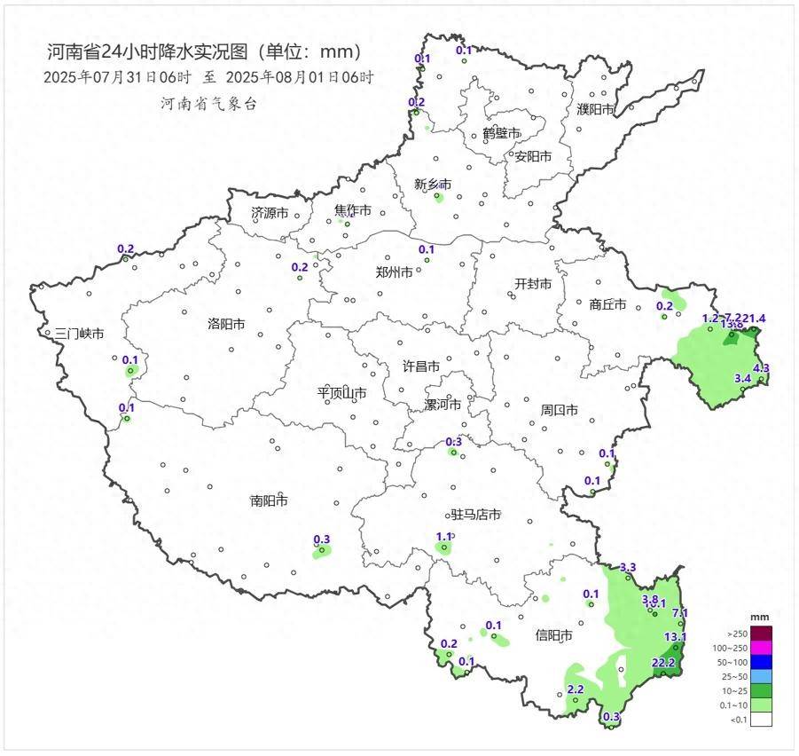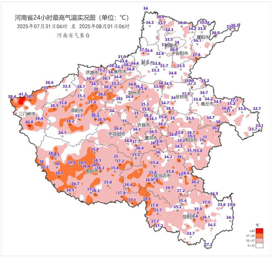 7月31日白天到夜里,受台风外围雨带影响,商丘东部和信阳东部等地出现分散性阵雨雷阵雨。不过降水范围有限,炎热依旧是“主旋律”,西部和南部不少地方出现了37℃以上的高温,其中灵宝市西闫站最高气温达到了41.3℃,位居全省榜首。