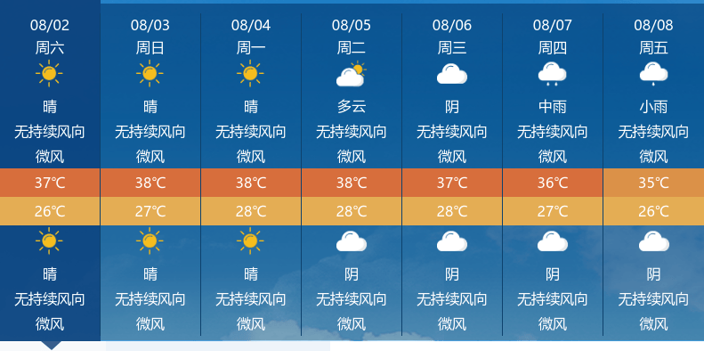 未来三天,随州天气以晴为主,8月3日最高气温38℃,最低气温27℃;8月4日最高气温38℃,最低气温28℃;8月5日天气转为多云,气温维持在28℃至38℃之间。建议公众注意防晒,避免长时间暴露在高温环境中,同时关注午后多云天气对体感温度的影响。