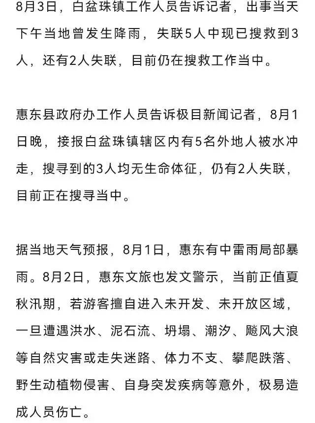 2025年8月1日20时22分许,110警情接到一位群众报警称,与其一同到惠东县白盆珠镇白马村白马山的5名人员在游玩过程中被水冲走失联。接警后,惠东县应急、公安、消防、白盆珠镇政府等部门组织专业救援力量立即赶往事发地连夜全力展开搜救。
