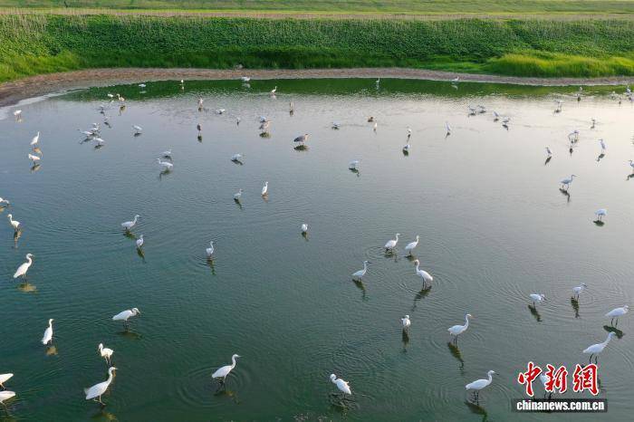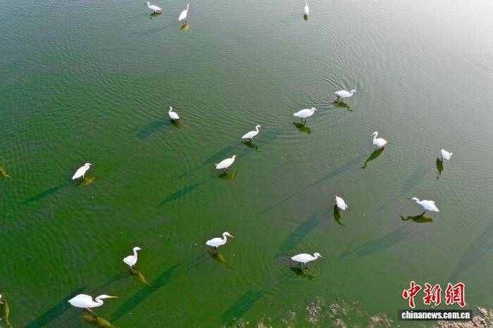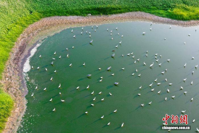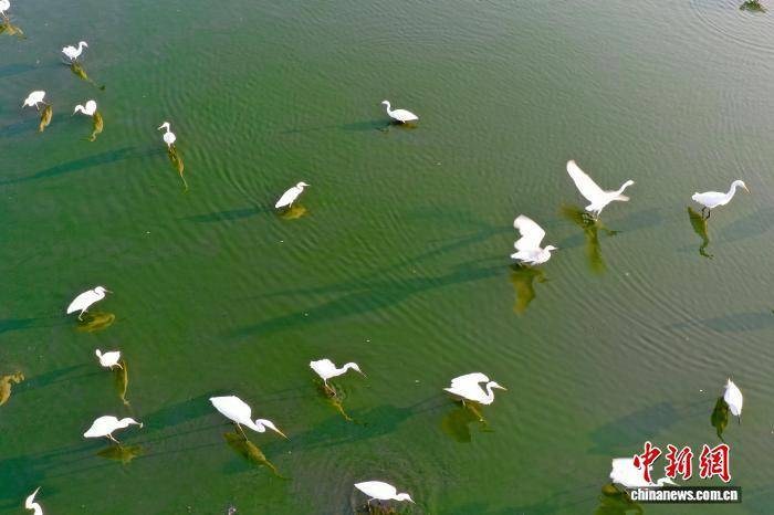 8月3日,一群白鹭在河南省三门峡市湖滨区王官黄河湿地飞舞、觅食。白鹭与水中倒影、投影同框,仿佛李白诗中“对影成三人”的意境 。(无人机照片)王建栋 摄