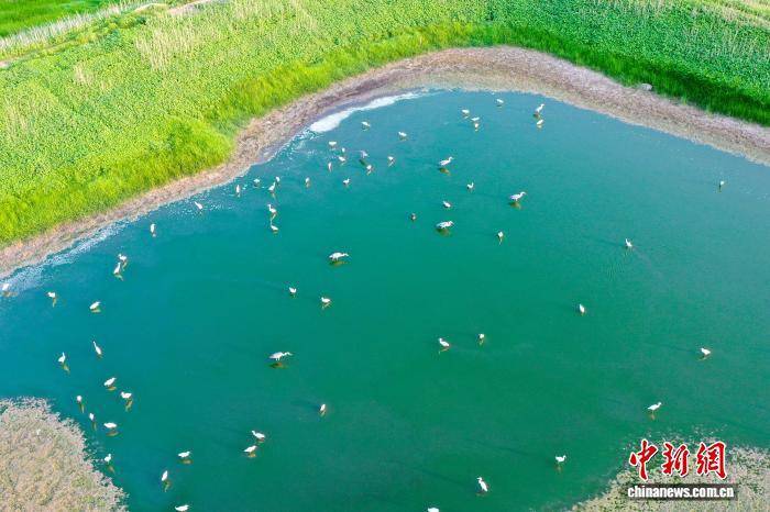 8月3日,一群白鹭在河南省三门峡市湖滨区王官黄河湿地飞舞、觅食。白鹭与水中倒影、投影同框,仿佛李白诗中“对影成三人”的意境 。(无人机照片) 王建栋 摄