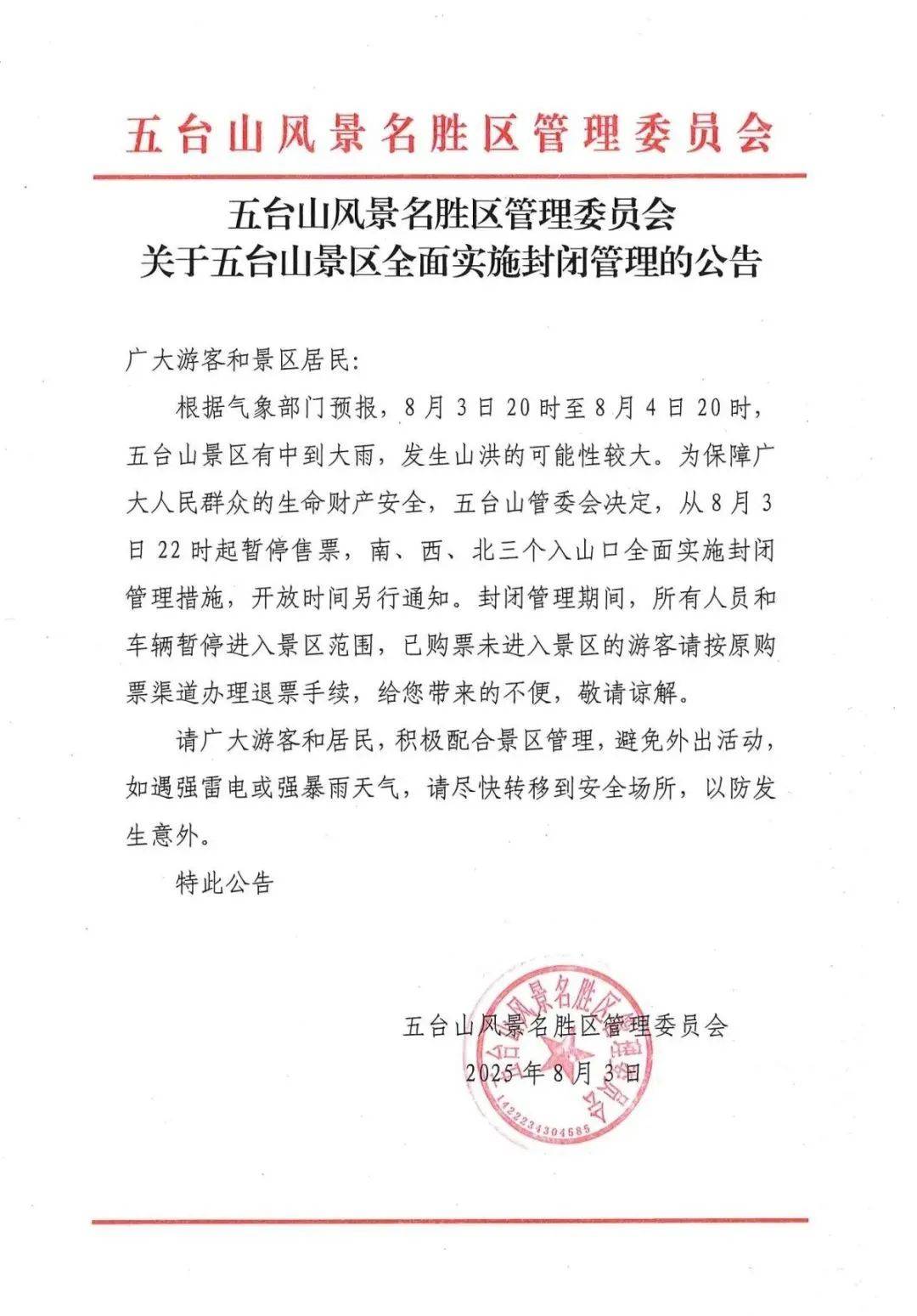 8月3日21时,五台山景区发布通知,从8月3日22时起暂停售票,南、西、北三个入山口全面实施封闭管理措施,开放时间另行通知。具体如下:
