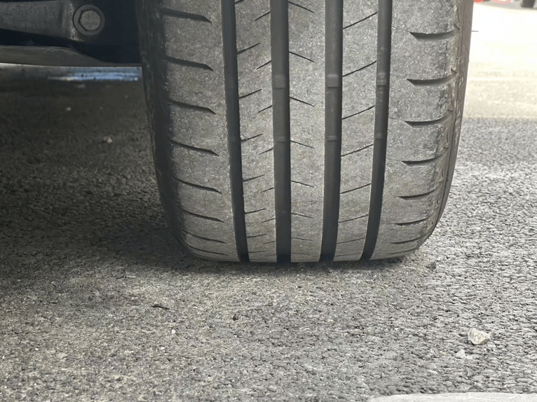 讲完空调系统,不得不提影响续航的另一个因素——轮胎。由于宝马的底盘调教,轮胎是存在倾角的,也就是看起来会有点轻微的外八字。